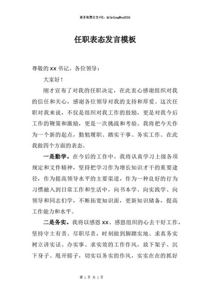 【七哥公文】2025年:任职表态发言模板+更多免费公文+VX:QiGeGongWen2024