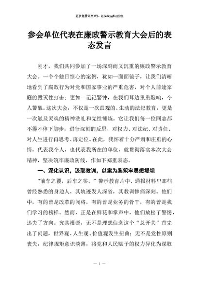 / 【七哥公文】2025年:参会单位代表在廉政警示教育大会后的表态发言+更多免费公文+VX:QiGeGongWen2024