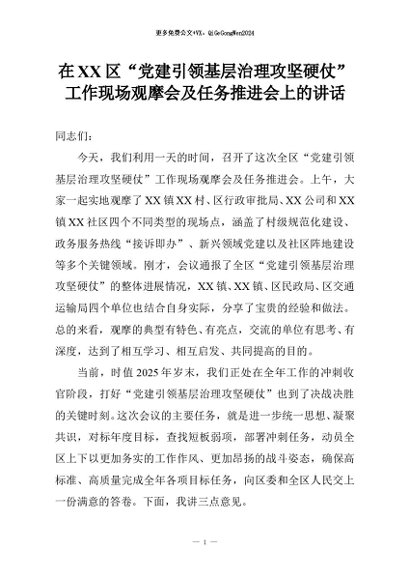 【七哥公文】2025年:在XX区“党建引领基层治理攻坚硬仗”工作现场观摩会及任务推进会上的讲话+更多免费公文+VX:QiGeGongWen2024
