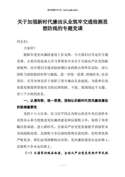 【七哥公文】2025年:关于加强新时代廉洁从业筑牢交通检测思想防线的专题党课+更多免费公文+VX:QiGeGongWen2024