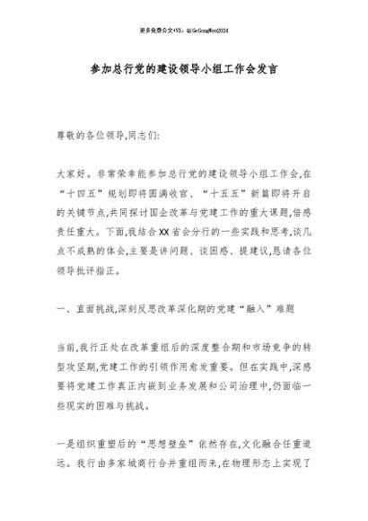 【七哥公文】2025年:参加总行党的建设领导小组工作会发言(银行)_副本+更多免费公文+VX:QiGeGongWen2024
