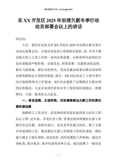 【七哥公文】2025年:在XX开发区2025年治理欠薪冬季行动动员部署会议上的讲话+更多免费公文+VX:QiGeGongWen2024