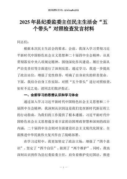 【七哥公文】2025年:2025年县纪委监委主任民主生活会“五个带头”对照检查发言材料+更多免费公文+VX:QiGeGongWen2024