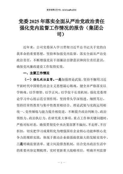 【七哥公文】2025年:党委2025年落实全面从严治党政治责任强化党内监督工作情况的报告(集团公司)+更多免费公文+VX:QiGeGongWen2024