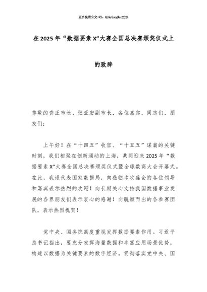 【七哥公文】2025年:在2025年“数据要素X”大赛全国总决赛颁奖仪式上的致辞_副本+更多免费公文+VX:QiGeGongWen2024