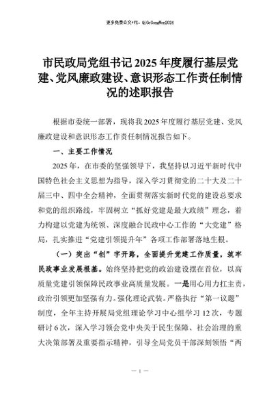 【七哥公文】2025年:市民政局党组书记2025年度履行基层党建、党风廉政建设、意识形态工作责任制情况的述职报告+更多免费公文+VX:QiGeGongWen2024