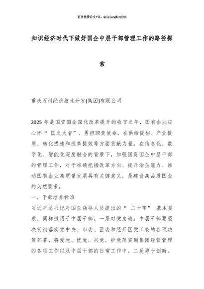 【七哥公文】2025年:知识经济时代下做好国企中层干部管理工作的路径探索_副本+更多免费公文+VX:QiGeGongWen2024