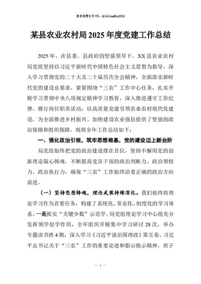 / 【七哥公文】2025年:某县农业农村局2025年度党建工作总结+更多免费公文+VX:QiGeGongWen2024