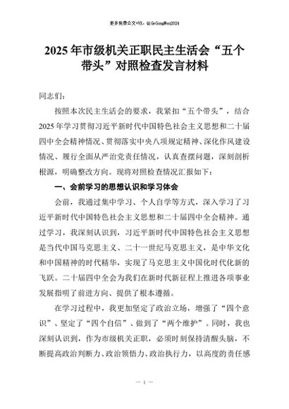 【七哥公文】2025年:2025年市级机关正职民主生活会“五个带头”对照检查发言材料+更多免费公文+VX:QiGeGongWen2024