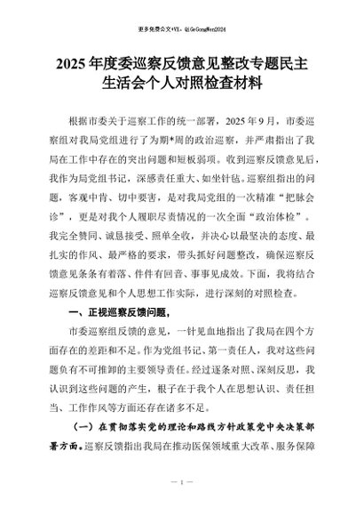 【七哥公文】2025年:2025年度委巡察反馈意见整改专题民主生活会个人对照检查材料+更多免费公文+VX:QiGeGongWen2024