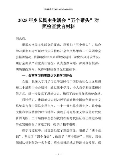 【七哥公文】2025年:2025年乡长民主生活会“五个带头”对照检查发言材料+更多免费公文+VX:QiGeGongWen2024