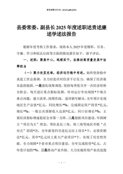 【七哥公文】2025年:县委常委、副县长2025年度述职述责述廉述学述法报告+更多免费公文+VX:QiGeGongWen2024