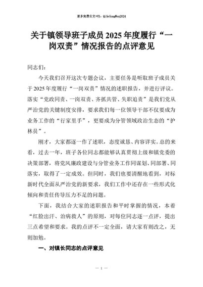 【七哥公文】2025年:关于镇领导班子成员2025年度履行“一岗双责”情况报告的点评意见+更多免费公文+VX:QiGeGongWen2024