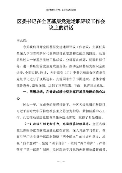 / 【七哥公文】2025年:区委书记在全区基层党建述职评议工作会议上的讲话+更多免费公文+VX:QiGeGongWen2024