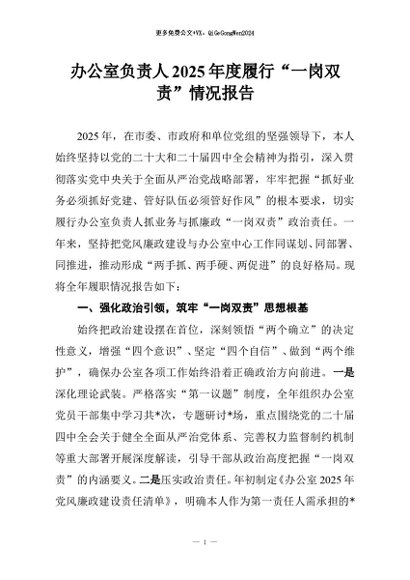 / 【七哥公文】2025年:办公室负责人2025年度履行“一岗双责”情况报告+更多免费公文+VX:QiGeGongWen2024