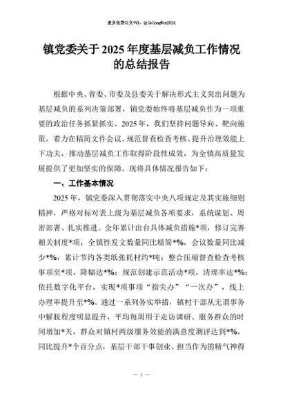/ 【七哥公文】2025年:镇党委关于2025年度基层减负工作情况的总结报告+更多免费公文+VX:QiGeGongWen2024