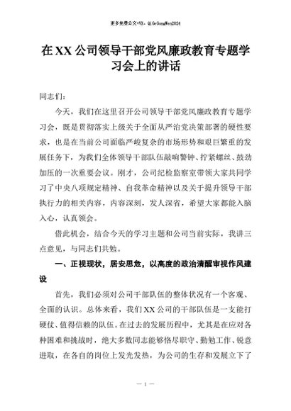 / 【七哥公文】2025年:在XX公司领导干部党风廉政教育专题学习会上的讲话+更多免费公文+VX:QiGeGongWen2024