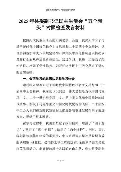【七哥公文】2025年:2025年县委副书记民主生活会“五个带头”对照检查发言材料+更多免费公文+VX:QiGeGongWen2024