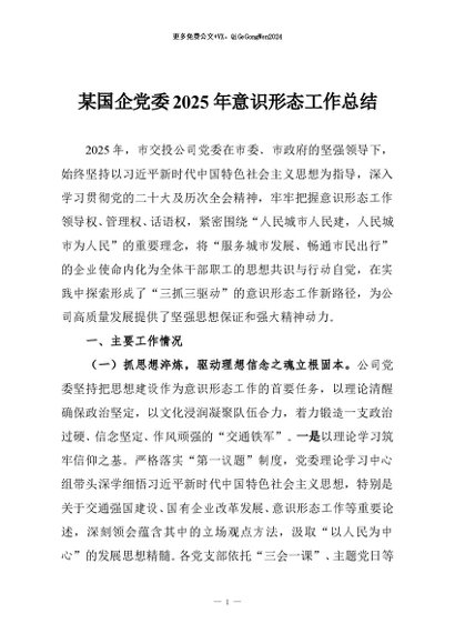 / 【七哥公文】2025年:某国企党委2025年意识形态工作总结+更多免费公文+VX:QiGeGongWen2024