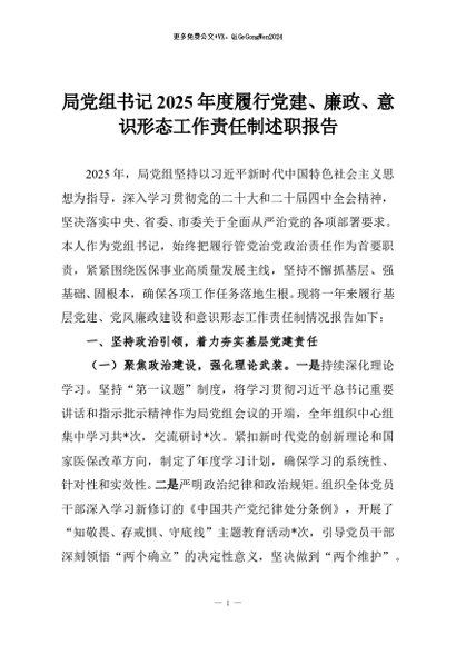 【七哥公文】2025年:局党组书记2025年度履行党建、廉政、意识形态工作责任制述职报告+更多免费公文+VX:QiGeGongWen2024