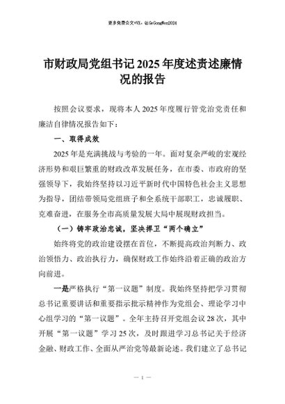 / 【七哥公文】2025年:市财政局党组书记2025年度述责述廉情况的报告+更多免费公文+VX:QiGeGongWen2024