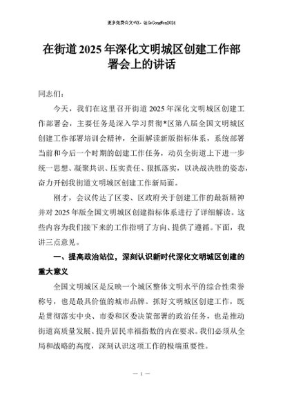 【七哥公文】2025年:在街道2025年深化文明城区创建工作部署会上的讲话+更多免费公文+VX:QiGeGongWen2024