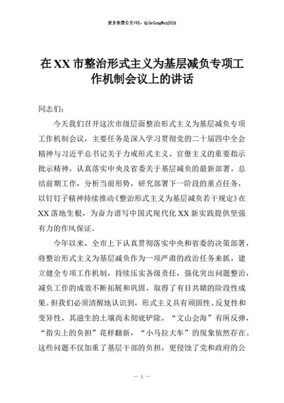 【七哥公文】2025年:在XX市整治形式主义为基层减负专项工作机制会议上的讲话+更多免费公文+VX:QiGeGongWen2024