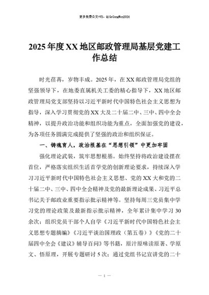 / 【七哥公文】2025年:2025年度XX地区邮政管理局基层党建工作总结+更多免费公文+VX:QiGeGongWen2024