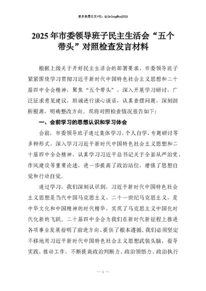 【七哥公文】2025年:2025年市委领导班子民主生活会“五个带头”对照检查发言材料+更多免费公文+VX:QiGeGongWen2024