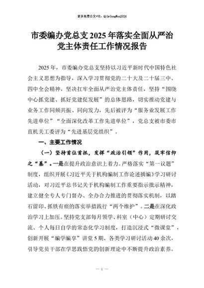 【七哥公文】2025年:市委编办党总支2025年落实全面从严治党主体责任工作情况报告+更多免费公文+VX:QiGeGongWen2024