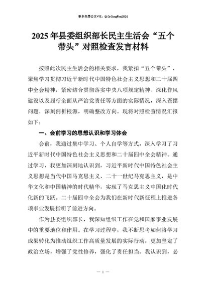 【七哥公文】2025年:2025年县委组织部长民主生活会“五个带头”对照检查发言材料+更多免费公文+VX:QiGeGongWen2024