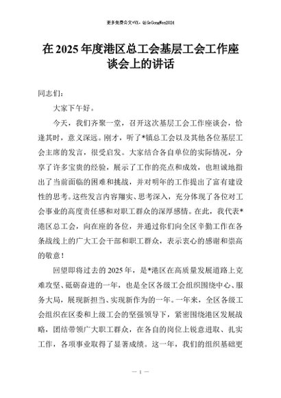 / 【七哥公文】2025年:在2025年度港区总工会基层工会工作座谈会上的讲话+更多免费公文+VX:QiGeGongWen2024