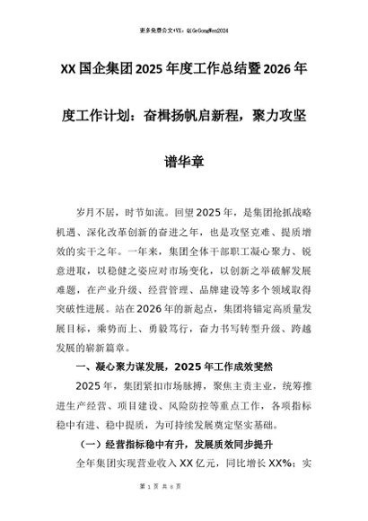 【七哥公文】2025年:XX国企集团2025年度工作总结暨2026年度工作计划:奋楫扬帆启新程,聚力攻坚谱华章+更多免费公文+VX:QiGeGongWen2024