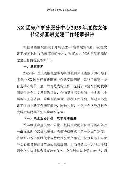 【七哥公文】2025年:XX区房产事务服务中心2025年度党支部书记抓基层党建工作述职报告+更多免费公文+VX:QiGeGongWen2024