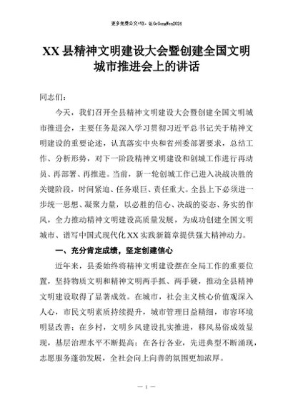 【七哥公文】2025年:XX县精神文明建设大会暨创建全国文明城市推进会上的讲话+更多免费公文+VX:QiGeGongWen2024