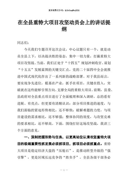 / 【七哥公文】2025年:在全县重特大项目攻坚动员会上的讲话提纲+更多免费公文+VX:QiGeGongWen2024