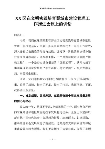【七哥公文】2025年:XX区在文明实践培育暨城市建设管理工作推进会议上的讲话+更多免费公文+VX:QiGeGongWen2024