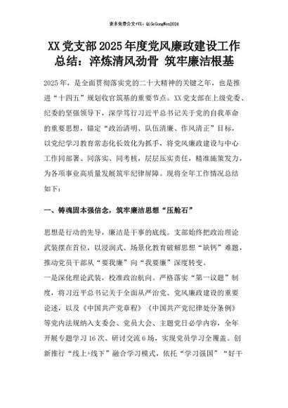 【七哥公文】2025年:XX党支部2025年度党风廉政建设工作总结:淬炼清风劲骨 筑牢廉洁根基+更多免费公文+VX:QiGeGongWen2024
