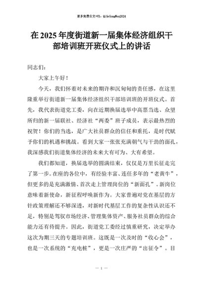 【七哥公文】2025年:在2025年度街道新一届集体经济组织干部培训班开班仪式上的讲话+更多免费公文+VX:QiGeGongWen2024