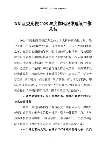 / 【七哥公文】2025年:XX区委党校2025年度作风纪律建设工作总结+更多免费公文+VX:QiGeGongWen2024