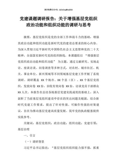 【七哥公文】2025年:党建课题调研报告:关于增强基层党组织政治功能和组织功能的调研与思考+更多免费公文+VX:QiGeGongWen2024