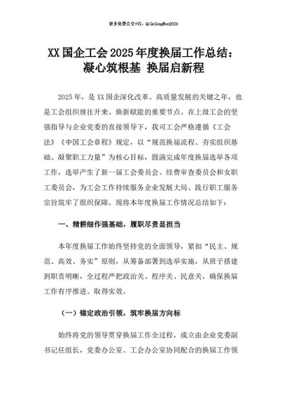 【七哥公文】2025年:XX国企工会2025年度换届工作总结:凝心筑根基 换届启新程_副本+更多免费公文+VX:QiGeGongWen2024