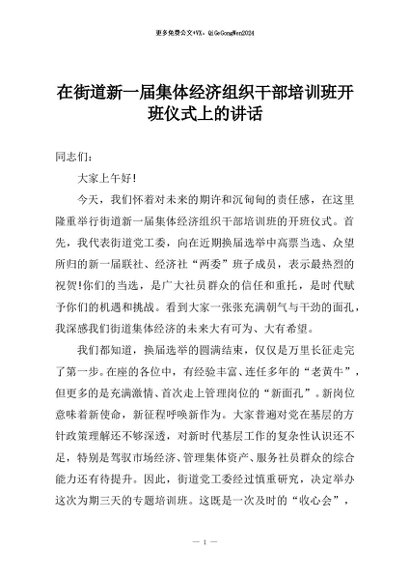 【七哥公文】2025年:在街道新一届集体经济组织干部培训班开班仪式上的讲话+更多免费公文+VX:QiGeGongWen2024