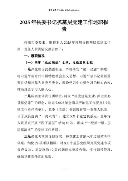 / 【七哥公文】2025年:2025年县委书记抓基层党建工作述职报告+更多免费公文+VX:QiGeGongWen2024