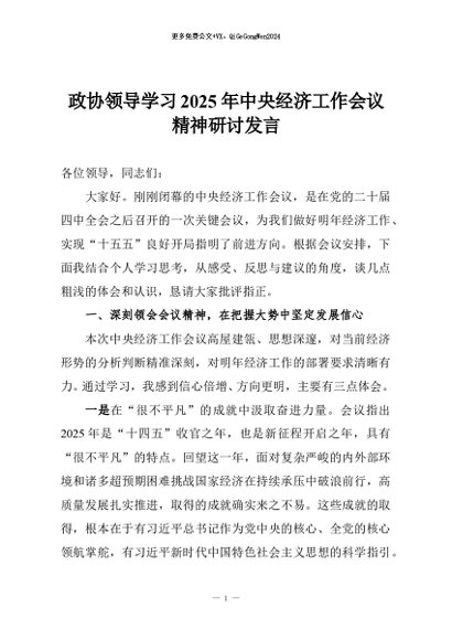 【七哥公文】2025年:政协领导学习2025年中央经济工作会议精神研讨发言+更多免费公文+VX:QiGeGongWen2024