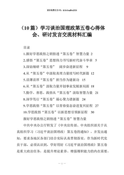 【七哥公文】2025年:(10篇)学习谈治国理政第五卷心得体会、研讨发言交流材料汇编+更多免费公文+VX:QiGeGongWen2024