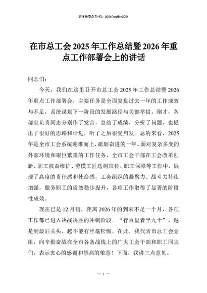 【七哥公文】2025年:在市总工会2025年工作总结暨2026年重点工作部署会上的讲话+更多免费公文+VX:QiGeGongWen2024