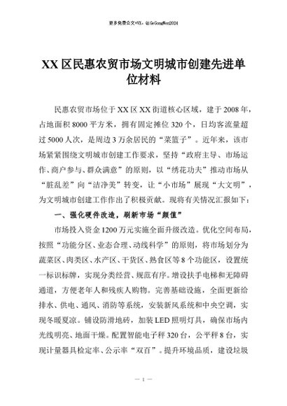 / 【七哥公文】2025年:XX区民惠农贸市场文明城市创建先进单位材料+更多免费公文+VX:QiGeGongWen2024