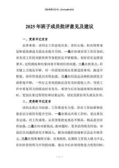 / 【七哥公文】2025年:2025年班子成员批评意见及建议+更多免费公文+VX:QiGeGongWen2024