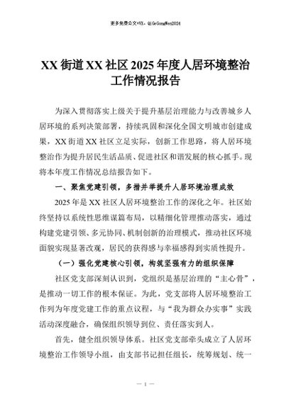 【七哥公文】2025年:XX街道XX社区2025年度人居环境整治工作情况报告+更多免费公文+VX:QiGeGongWen2024